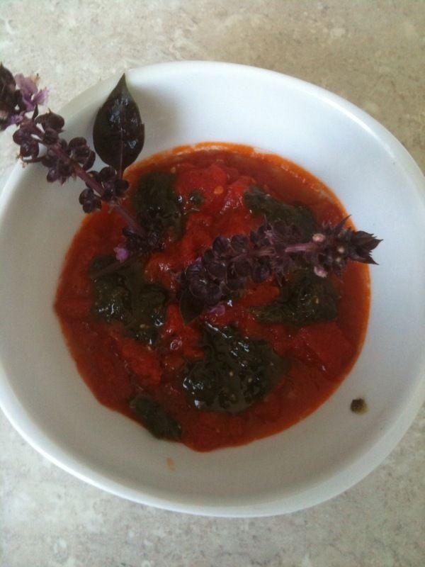Pour 4 personnes : 6 grosses tomates mûres mais fermes, 1 bouquet de basilic, 4 cuillerées à soupe d'huile d'olive, sucre, sel.
