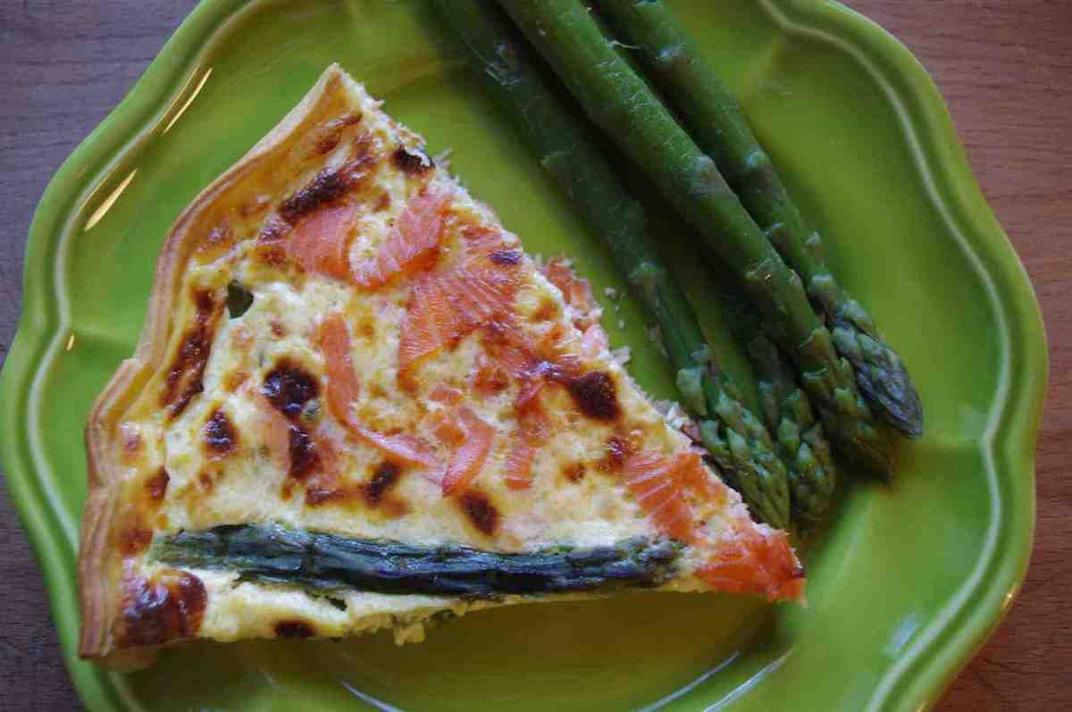 1 pâte brisée / 2 oeufs / 10 asperges fraîches ou congelées / 5 tranches de saumon fumé / 1 fromage de chèvre / 1 petit pot de crème fraîche / sel et poivre.