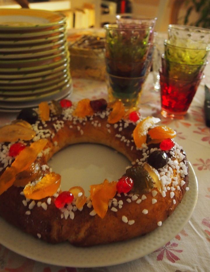 Galette des rois provençale : 60 g de sucre en poudre / 2 sachets de sucre vanillé / 200 g de farine / 130 g de beurre mou / 200 g de fruits confits / 5 jaunes d'oeufs / 1 c à soupe de fleur d'oranger / 20 g de levure fraîche de boulanger / 3 cuillères à café de sucre en gros grains.