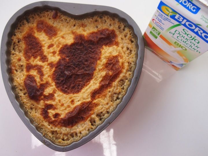 Pour 4 à 6 personnes : 125 g de riz / 1 l de lait de soja Bjorg / 80 g de sucre blond / 1 gousse de vanille / 2 oeufs entiers.