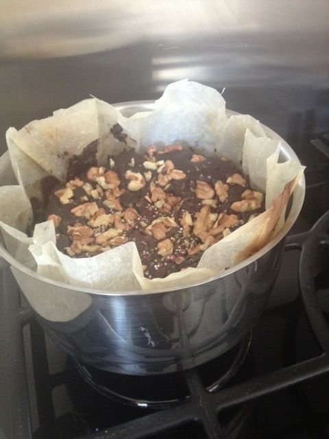 Laver essuyer la casserole et tapisser le fond et le bord d'une quadruple épaisseur de papier sulfurisé.Verser la préparation. Parsemer de morceaux de noix et couvrir.