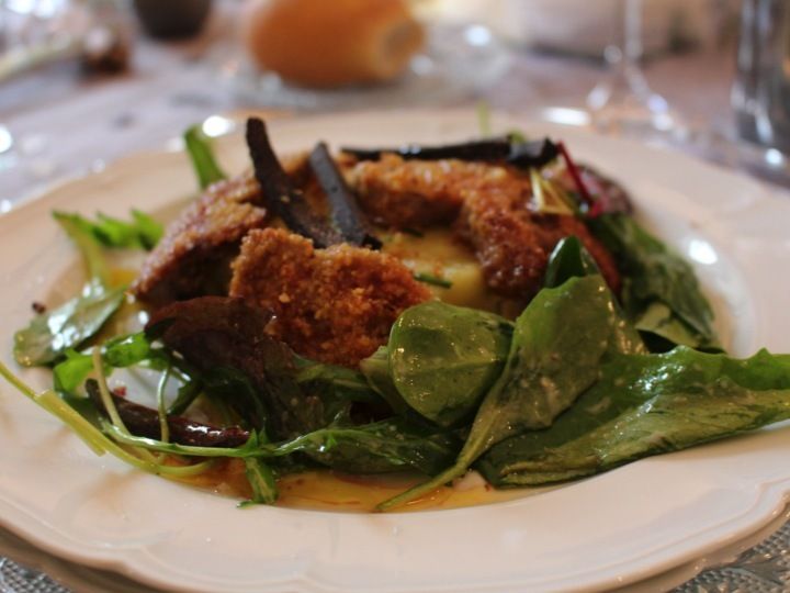 Escalope de foie gras frais pannée sur une purée à l'huile de truffe