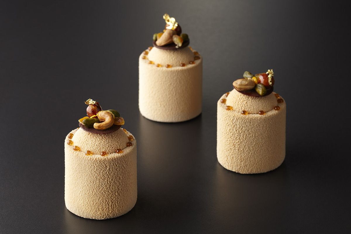 Nouvelle création signature dans la lignée de l’Equinoxe, le Dulcey, qui tire son nom du chocolat blond Valrhona, est une véritable madeleine de Proust avec ses notes de praliné, de caramel et de Gianduja. Le jeu des textures n’est pas en reste avec un subtil équilibre de croquant et de crémeux, révélé par un cœur coulant au caramel beurre salé.