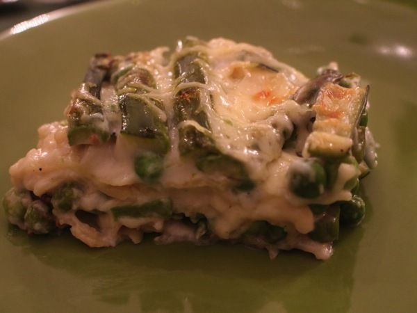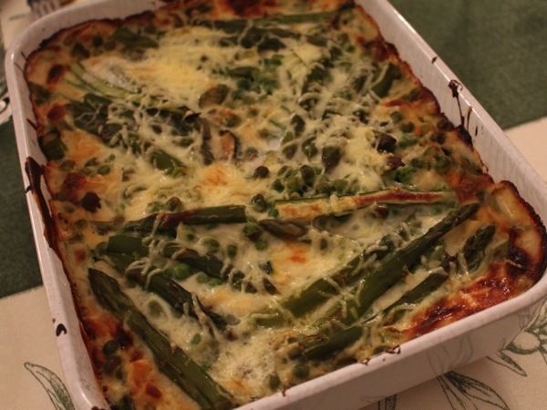 Pour 6 personnes : 500 g de feuilles de lasagnes / 1 litre de béchamel / bouillon de légumes / 500 g de mozzarella / 100 g de parmesan / 1 botte d'asperges vertes / 300 g de petits pois écossés / 1 botte d'oignon nouveaux / 2 courgettes / 3 c. à soupe d'huile d'olive / 20 g de beurre / sel poivre noix muscade.
