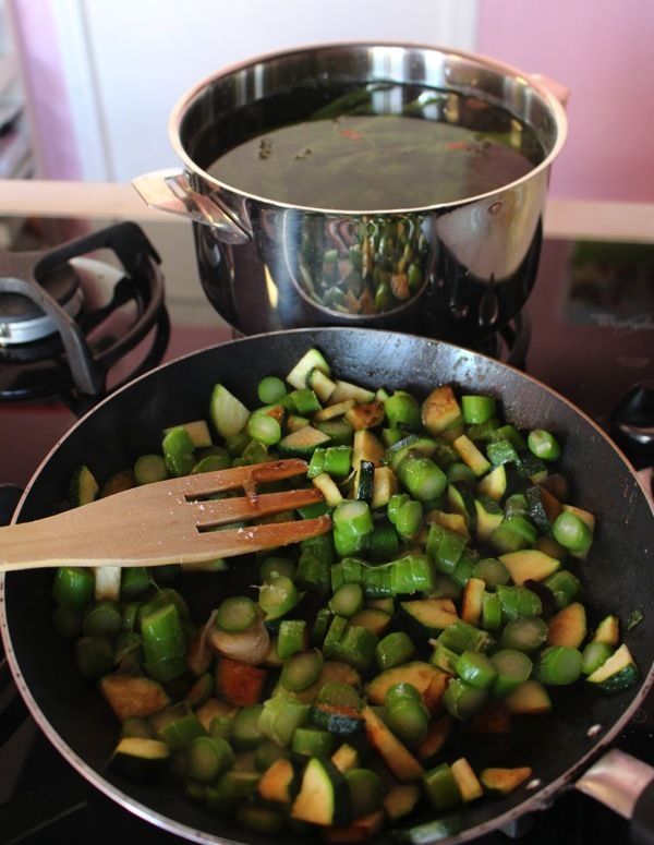 Couper les asperges vertes en rondelles, les oignons avec le vert et les courgettes en dés.