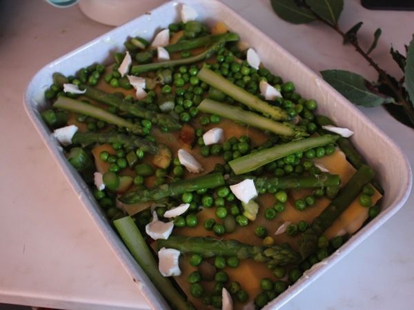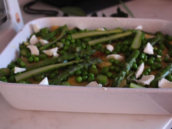 Beurrer un plat à gratin, Disposer une couche de feuilles de lasagnes, une fine couche de béchamel, une couche de légumes, les pointes d'asperges coupées en deux, des morceaux de mozzarella puis saupoudrer de parmesan. Répéter l'opération 3 fois.