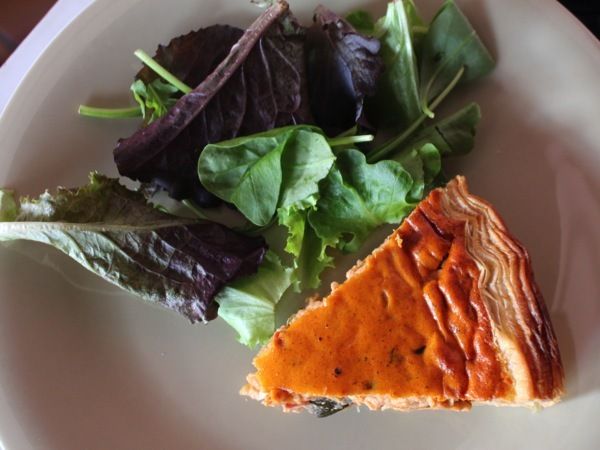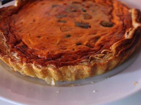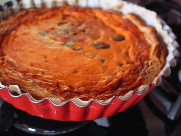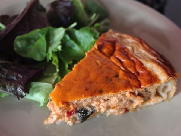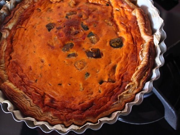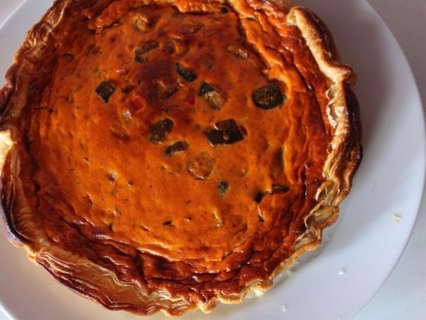 Pour 6 personnes : 1 rouleau de pâte feuilletée / 500 g de ratatouille / 4 oeufs / 20 cl de crème liquide / 1/2 c; à café de piment d'Espelette / sel.
