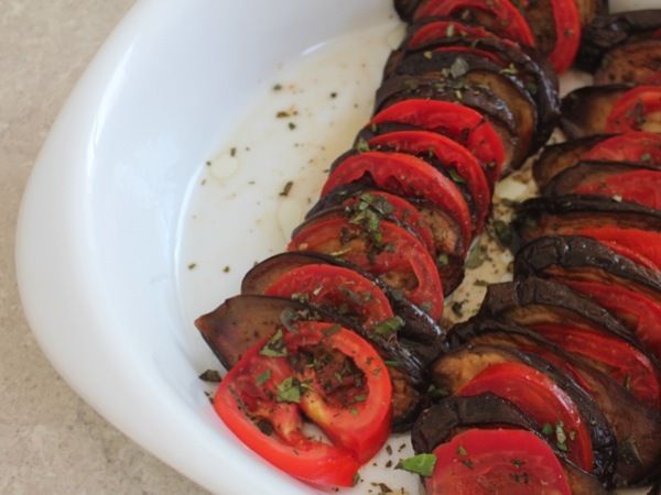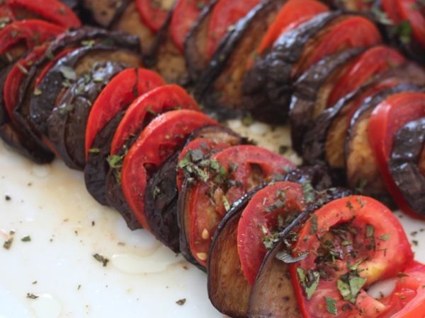 Frotter un plat à four avec une gousse d'ail. Ranger en alternant les aubergines et les tomates. Saupoudrer avec les herbes ciselées.