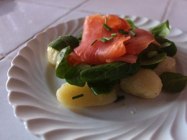 Dans des assiettes individuelles, placer les pommes de terre, répartir la salade et les copeaux de saumon fumé.